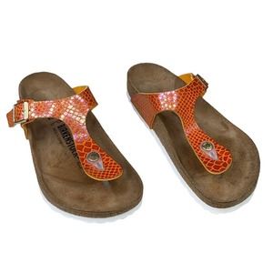 Stylish Birkenstock sandals. Vibrant orange straps. Comfortable cork footbed.