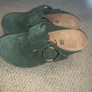 Birkenstock Papillio Green Suede Buckle Wedge Clogs Women's 6 EU 36