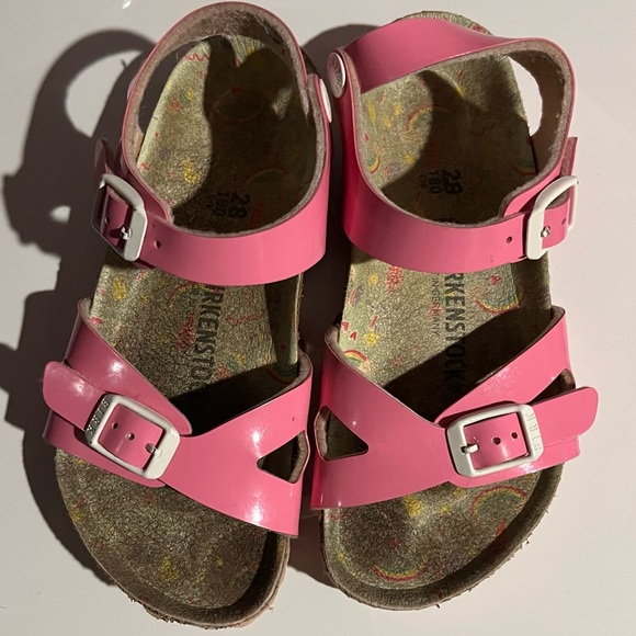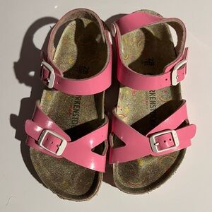 Birkenstock Rio kids sandal. Little kids size 10-10.5/28. Bubblegum pink patent leather with white buckles.