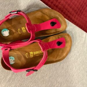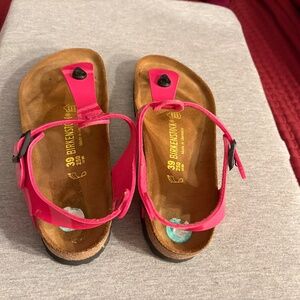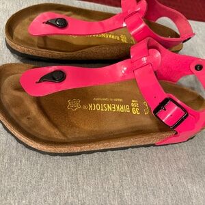 These are a pair of Birkenstock neon pink kairo sandals size 39/8.5 in US size. The sandals go through your toes and they are in good condition. The birkenstock emblem is inside of shoes.