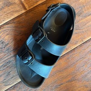 Birkenstock black sandals, Size 32, hard plastic, adjustable strap, heel to toe measures 8 3/4” long, lightly worn