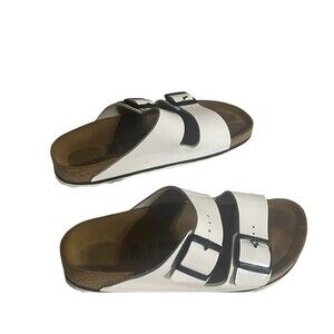 Birkenstock Sandals Womens 38 Arizona Buckle Straps Flats White Leather Slip On