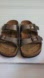 These women's metallic Birkenstock sandals are in good condition. They show some wear but the insoles have been cleaned up and there are some light scuffs to the tops