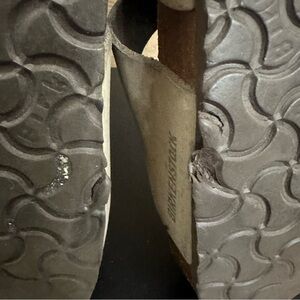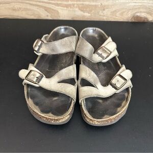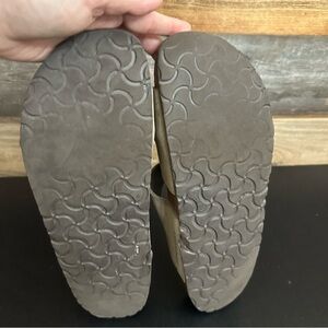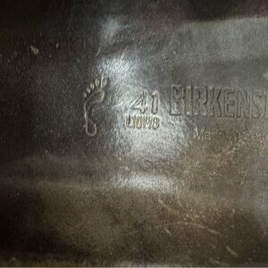 These tan leather slip on Birkenstocks are an EU size 41 ladies size 10 men’s size 8, and are in fair preowned condition. Please see photos as they show all of the imperfections and are part of the description showing the wear and condition of the shoes. Questions? Leave a comment below!
