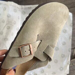 Comfortable suede mules with adjustable strap. Classic Birkenstock design.