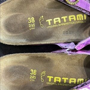 Stylish Tatami sandals with a strappy design. Features a unique purple pattern. Comfortable footbed for all-day wear.