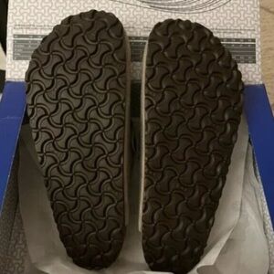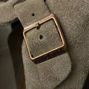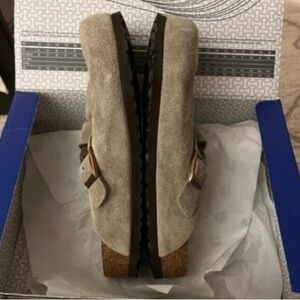 Taupe suede clogs with adjustable strap. Classic Birkenstock comfort.