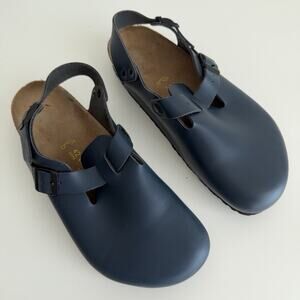 a sleek navy blue leather finish. Designed with an adjustable buckle strap, closed toe, and signature cork-latex footbed for all-day comfort. Effortlessly minimal and built to last — a timeless staple for laid-back style.
