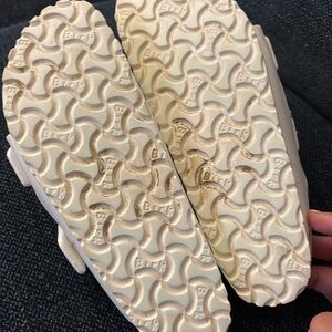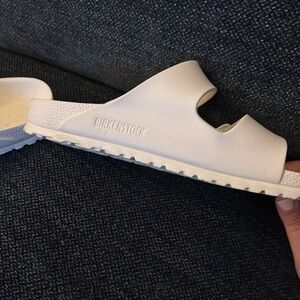 Experience ultimate comfort with these Birkenstock white sandals, featuring adjustable straps and a contoured footbed for a perfect fit. These are the Arizona Essentials not the leather.