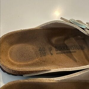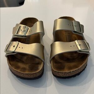 Elegant white sandals with shiny silver buckles. Features a comfortable cork footbed.