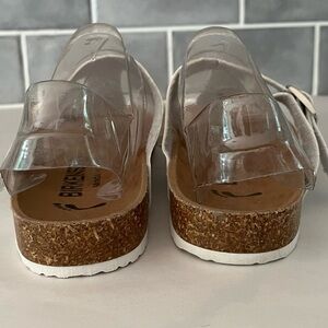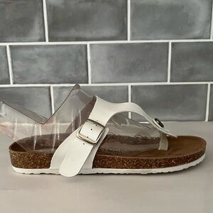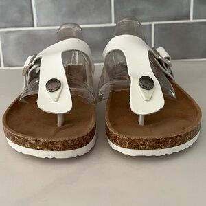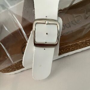 Stylish Birkenstock sandals. White strap with buckle. Comfortable brown footbed.