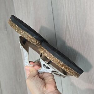Elegant white sandals with a supportive cork footbed. Adjustable straps for a perfect fit.