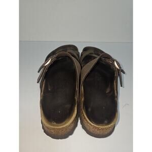 The Birkenstock Women's 39 8 Mayari Sandals in black are a stylish and comfortable choice for various occasions such as travel, activewear, weddings, parties, and casual outings. These slip-on thong sandals feature a flat heel and solid brown color with a leather lining and insole for added comfort. The classic design with a toe loop and buckle accents makes them a versatile option for all seasons, whether it's winter, summer, fall, or spring. Made in Germany, these Birkenstock Mayari sandals offer arch support and a standard shoe width for a perfect fit.
