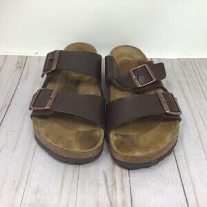 **Item Condition Notes:** Gently used - sole is lightly dirty from use but remains in excellent condition. These classic Birkenstock Arizona sandals feature the iconic double buckle design in rich dark brown Birko-Flor material. Size 39 fits women's 8-8.5 or men's 6-6.5. The sandals showcase Birkenstock's signature comfort with synthetic construction, leather lining, and synthetic sole for durability. Perfect for casual wear with the timeless slide style that Birkenstock is known for.