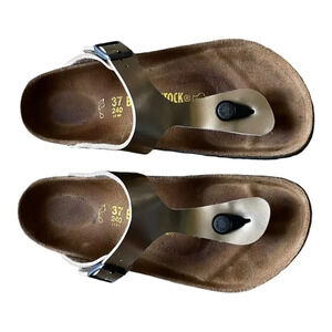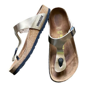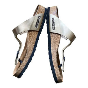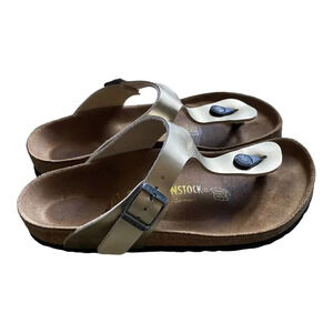 Preowned, Gently Birkenstock Womens Gold Brown Size US 6 Leather Slip-On Open Toe Sandals. It is in good preowned condition with no rips or tears. The soles are in good condition with no damage. Lots of life left.