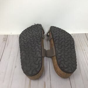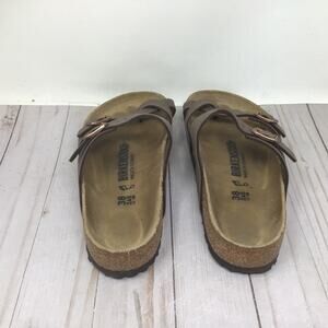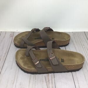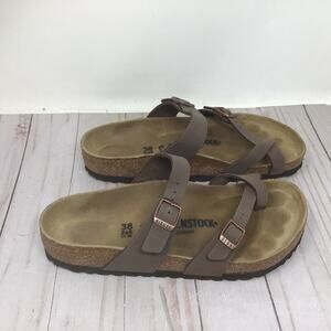 **Item Condition Notes:** Gently worn, soles are lightly dirty from use. Shoes are in excellent condition. Birkenstock Women's Mayari Sandal in Mocha color, EU Size 38 (US Women's Size 7-7.5). These comfortable slide sandals feature adjustable straps with buckle closures, a contoured footbed for superior comfort, and a durable cork midsole. Made with Birko-Flor upper material, these sandals offer the classic Birkenstock quality and support you expect. Perfect for casual wear and all-day comfort.