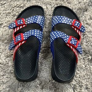 Red, white and blue slip on sandals. Buckles that can determine fit. Have been worn. See pics for wear.