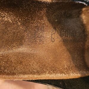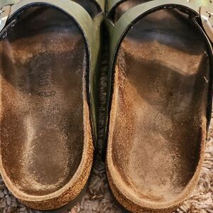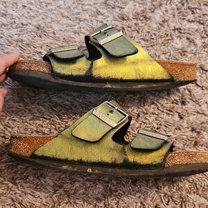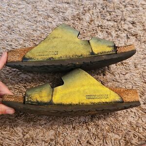 Shimmering with a bold metallic green finish, these Birkenstock Arizona sandals bring a fun twist to the iconic two-strap design. Made with genuine leather uppers, cork-latex footbeds, and EVA soles, they’re built for all-day comfort and timeless style. This pair is well worn with visible use on the footbeds and soles, and some creasing and darkening to the metallic surface. Perfect for casual wear, summer outings, or adding a unique pop of color to any laid-back outfit.