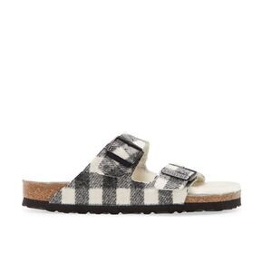 Black and white plaid wool upper; natural white shearling lining and black sole with cork footbed
