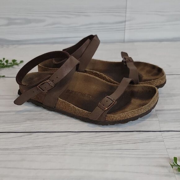 Ankle strap sandals in brown by Birkenstock with an iconic contoured footbed, a narrow style, and a slender sleek look. Good pre-owned condition with some signs of use. See pictures.