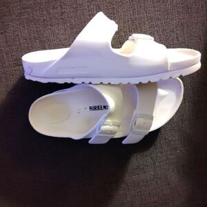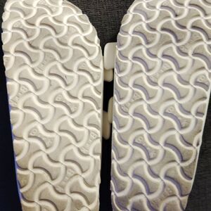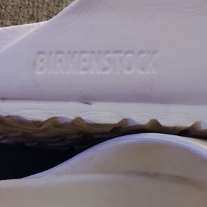 Experience ultimate comfort with these Birkenstock sandals, featuring a classic two-strap design in a clean white color. The adjustable buckles and signature contoured footbed ensure a perfect fit, while the cork-like sole provides a lightweight feel. Ideal for casual wear, these sandals offer a minimalist aesthetic with a matte finish on the straps.(loved vinyl, estimate size 6(