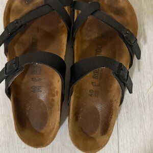 Double strap Mayari style Birkenstocks, slightly worn, footbed in good shape. Color Oiled Leather Black