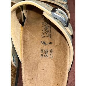 These Birkis women's sandals feature a multicolor floral pattern and a strappy design. They have adjustable buckle straps and a contoured cork footbed for comfort. The sandals are flat with a heel height under 1 inch, making them suitable for casual summer occasions. The closure is a buckle, and the outsole is made of cork. They are a US size 7 and EU size 38. This item is pre-owned.