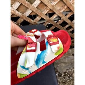 Birkis by Birkenstock Cuba Red Floral 3 Strap Buckle Slide Sandals