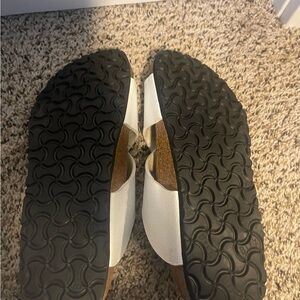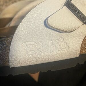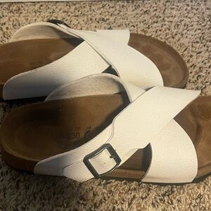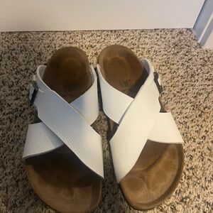 Step into comfort with these stylish white leather sandals. Perfect for any casual outing. Like new, pebble leather, made by Birkenstock.