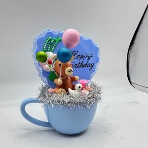 Hand made by me with all vintage found, reduced and reclaimed kitschy goodness. All one of a kind. This one has a tiny candle holder if you want to put a birthday candle in it - but please at your own risk and do not leave unattended. Nestled in a plastic doll tea cup with Happy Birthday cake decor and wood bear ornament.