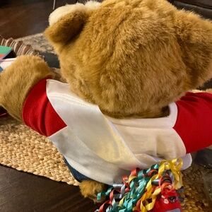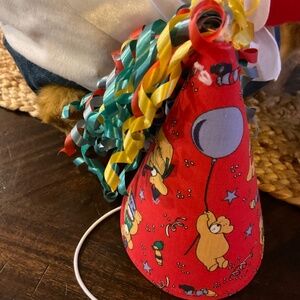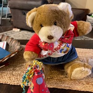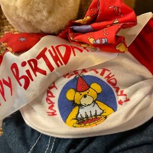 EUC, she is totally ready to celebrate in her cute denim skirt, happy birthday tee, and her birthday party hat and sash. Make you daughter’s even more special with this bear 🐻.