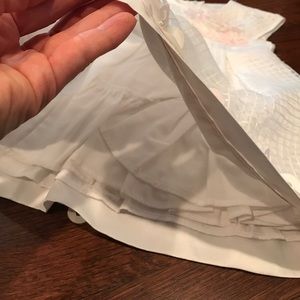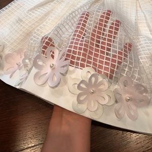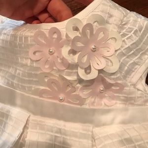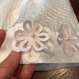 Sweetest little dress. Off white sheer overlay with satin cutout flowers attached with pearls. Zipper back with sash tie. Georgios on!!! Perfect for wedding or any other dress up occasion. Can be worn with a little cardigan. 18M.
