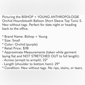Bishop + YOUNG ANTHROPOLOGIE Orchid Houndstooth Balloon Short Sleeve Tunic Small