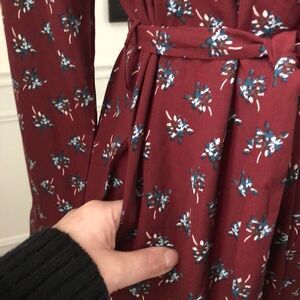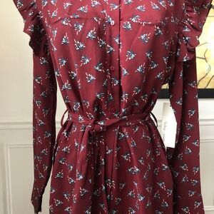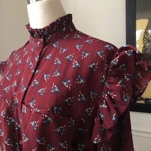 New with tags sample size small/4 Bishop + Young Elizabeth shirt dress with hi ruffle neck and ruffle shoulders in prairie style with tie sash waist. Burgundy floral and button front. Since this is a sample there is no brand or size tag, but the hang tag is attached. Pockets. Laying flat measures 34” from shoulder to hem, 21” from armpit to armpit and 21” straight across the waist, unbelted. Featured on my size small dress form for reference.