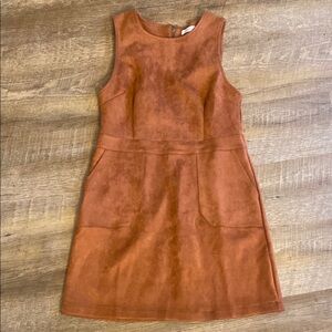 Excellent preowned condition. No rips, stains, or odors. See all photos. This Bishop + Young soft faux suede tan shift dress. You will love the pockets and the exposed zipper. Pair with booties to complete your look. This elegant tan sleeveless dress is perfect for any occasion. Its simple yet sophisticated design makes it a versatile addition to your wardrobe.