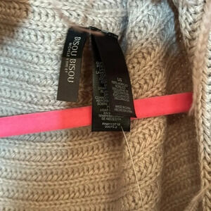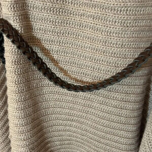 This is Maeve Bisou Bisou sweater cardigan vest in a large it is 100% acrylic. The feathers can be detached so the sweater may be machine washed cold. Comes with detachable brown braided belt.