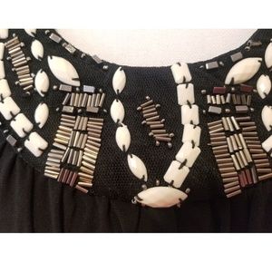 Only worn once! This is THE most comfortable dress. Made of stretchy black material with a bead-embellished, halter neckline. The neckline is extremely flattering when worn.
