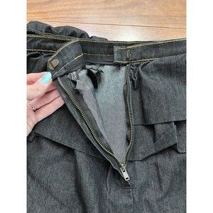 Listing is for a preowned item in great condition, black denim skirt ruffle top and back slit, sz 12, zipper and hook closure Waist: 15" Length: 21" Please use measurements to determine fit!