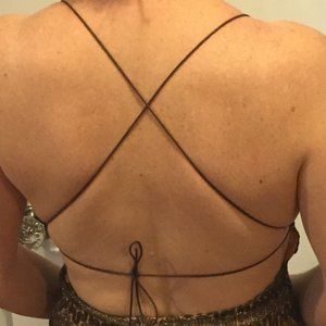 Bisou Bisou Dress Size Medium (but a 2 to 4 size in reality) designed by Michelle BohBot. Wore it to prom years ago. Perfect condition. No Flaws or Stains. Leather string strap. Photo of back on for detail. Green crochet design over peach lining. Smoke Free house.