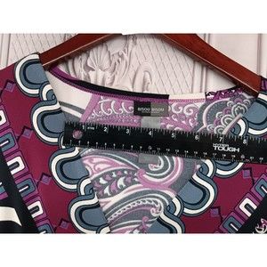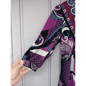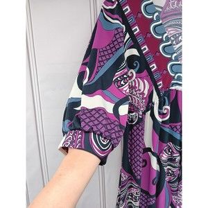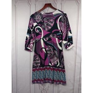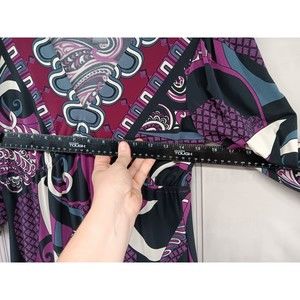 This beautiful Bisou Bisou dress is the perfect addition to your wardrobe! With a stretchy polyester blend material and a fitted bustline, this dress will hug your curves in all the right places. The V-neckline and puff sleeves add a touch of feminine elegance, while the paisley pattern and multicolored design make it a stylish and pretty option for many occasions.