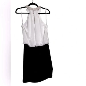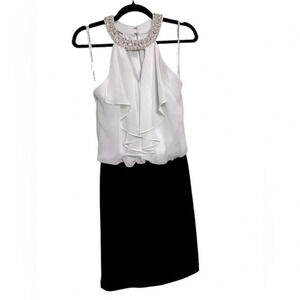 Serve elegance with a side of shimmer in this stunning black and ivory sheath dress from Bisou Bisou. Featuring a jeweled halter neckline, flattering blouson-style bodice, and a sleek pencil skirt, this is your go-to for weddings, cocktail parties, or any RSVP where showing up and showing out is required.