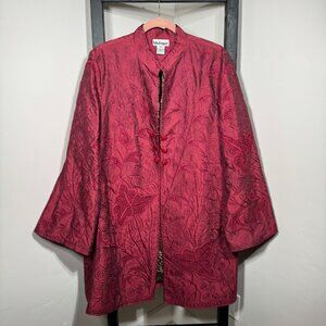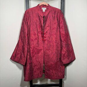Turn heads with this bold and sophisticated Bisou Bisou longline jacquard jacket! Featuring a rich red textured pattern and a chic leopard print lining, this piece is perfect for layering over dresses, trousers, or jeans. Its elegant yet edgy design makes it a versatile statement piece for fall, winter, or spring.