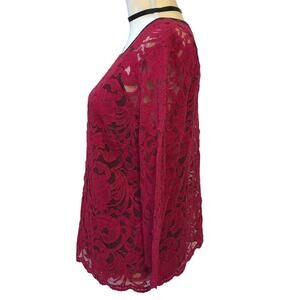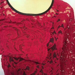 Excellent condition. Red Lace Blouse Women Size L. Scallop style cuffs & bottom hem, vinyl round neckline, button & hook for closure back, 3/4 sleeves. This blouse does not come with cami. I am including the Notations cami as a bundle. Chocker not included. Pictures are part of description.