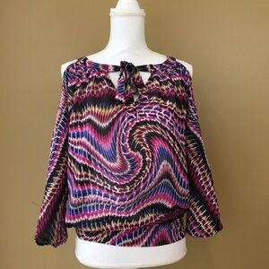 100% polyester, Size M. Long sleeves, cold shoulder Top with tie neck detail.
