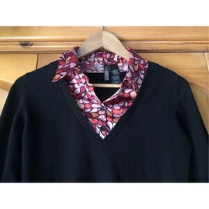 Bisou Bisou Michele Bohbot Sweater Size M Faux Collared Shirt Black V-Neck