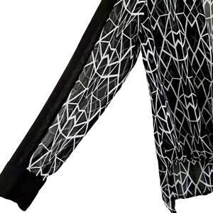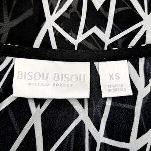 Bisou Bisou semi sheer faux wrap hi-lo top. Single snap closure.