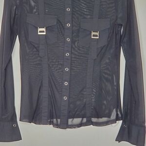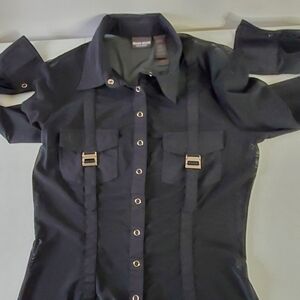 Bisou Bisou Michele Bohbot Sheer Black Blouse Size M Snap Front Long Sleeve Buckle Pocket Top.