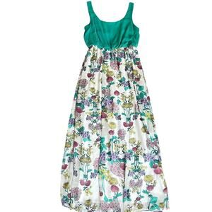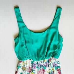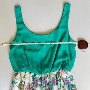 Teal top with floral skirt. Sleeveless design. Comfortable and flattering. Especially good if your midsection is your area of concern.
