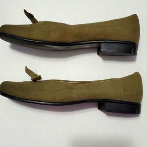 Textured fabric olive ballet flats with rounded tip. Cute bow on the toe area. 1" heels. These flats are in almost new condition.