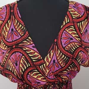 Eye-catching sheer blouse with intricate patterns. Features a flattering V-neck and smocked waist. Perfect for adding flair to any outfit.